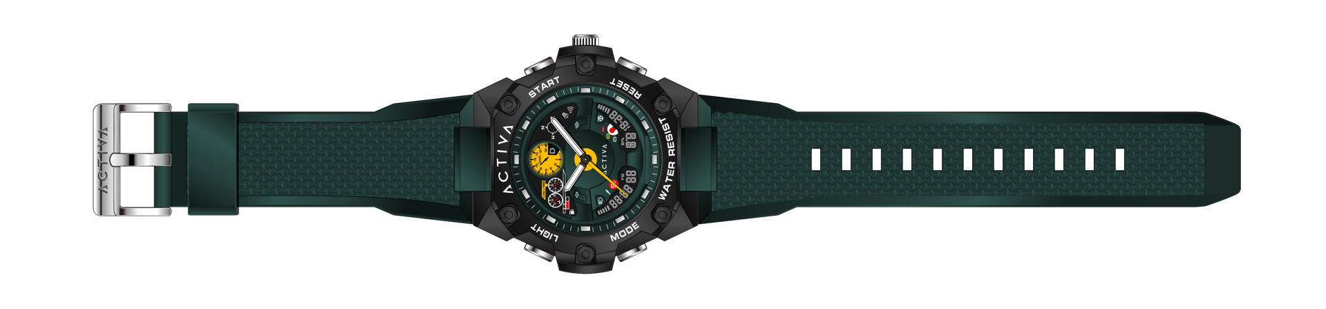 Denne vakre Activa-klokken har et presist digitalt urverk i tillegg til en svart urkasse. Urskiven har en urskive beskyttet av et svært slitesterkt krystallglass. Klokken har en grønn rem og er vanntett opptil 50 m.